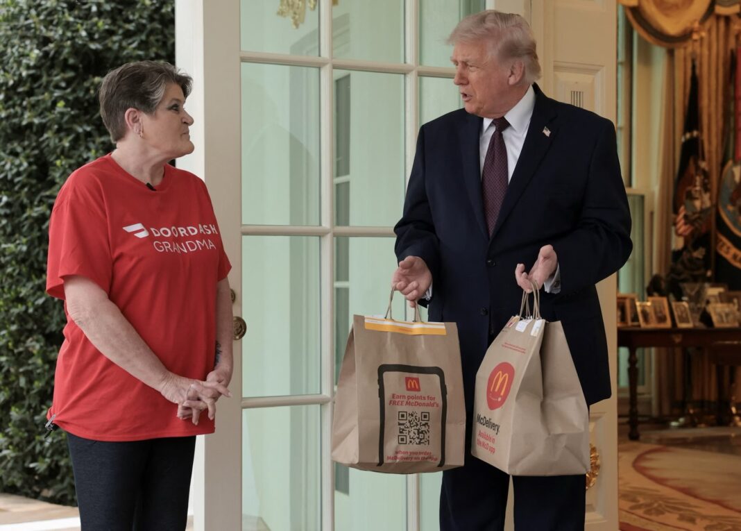 The delivery was handled by Sharon Simmons, a DoorDash driver from Arkansas affectionately known as the “DoorDash Grandma.” Dressed in a branded “DoorDash Grandma” T-shirt, Simmons knocked on the door just outside the Oval Office, carrying two bags of the president’s favorite meal: cheeseburgers and fries. Cameras captured the entire scene as Trump greeted her warmly.